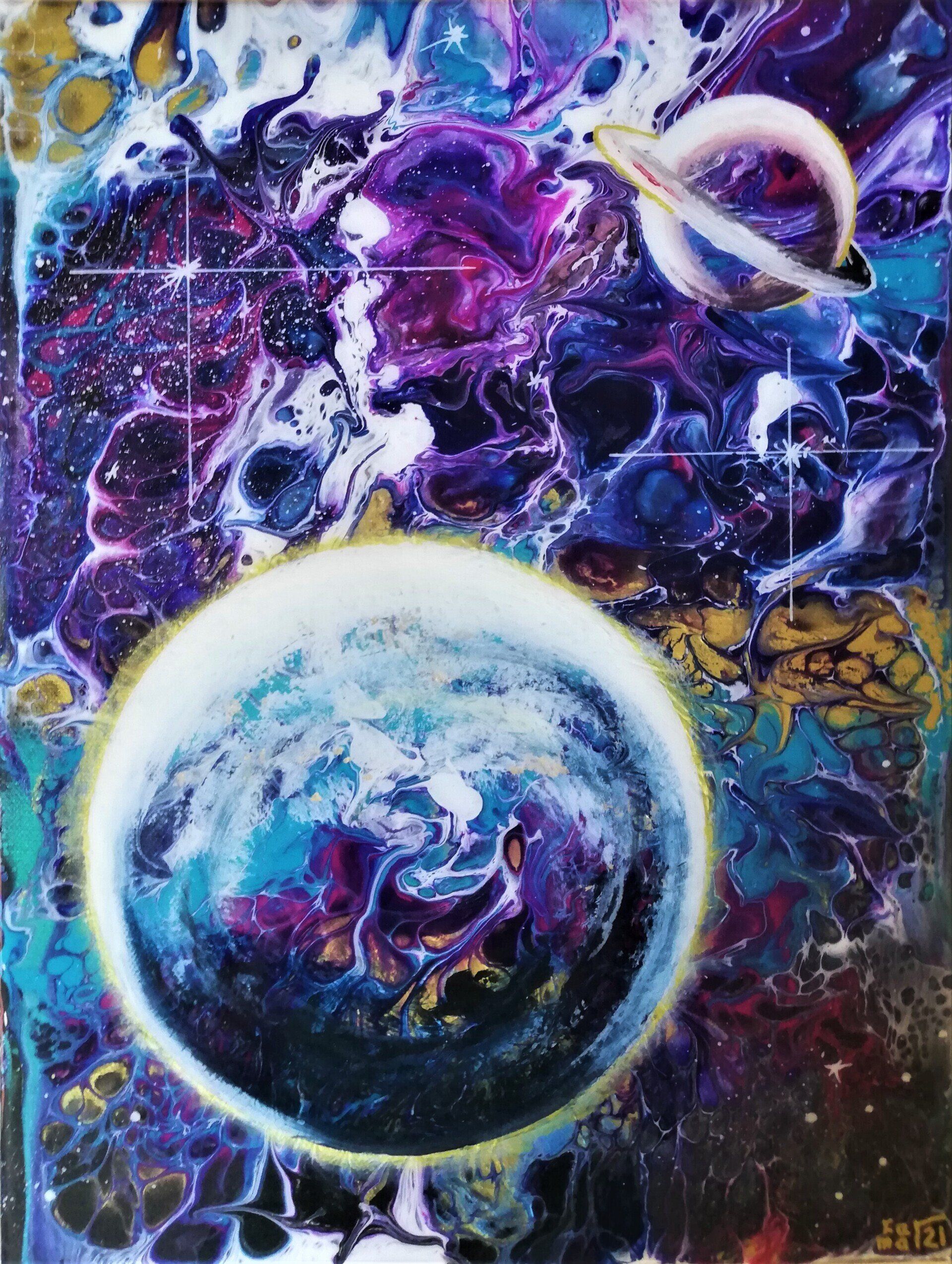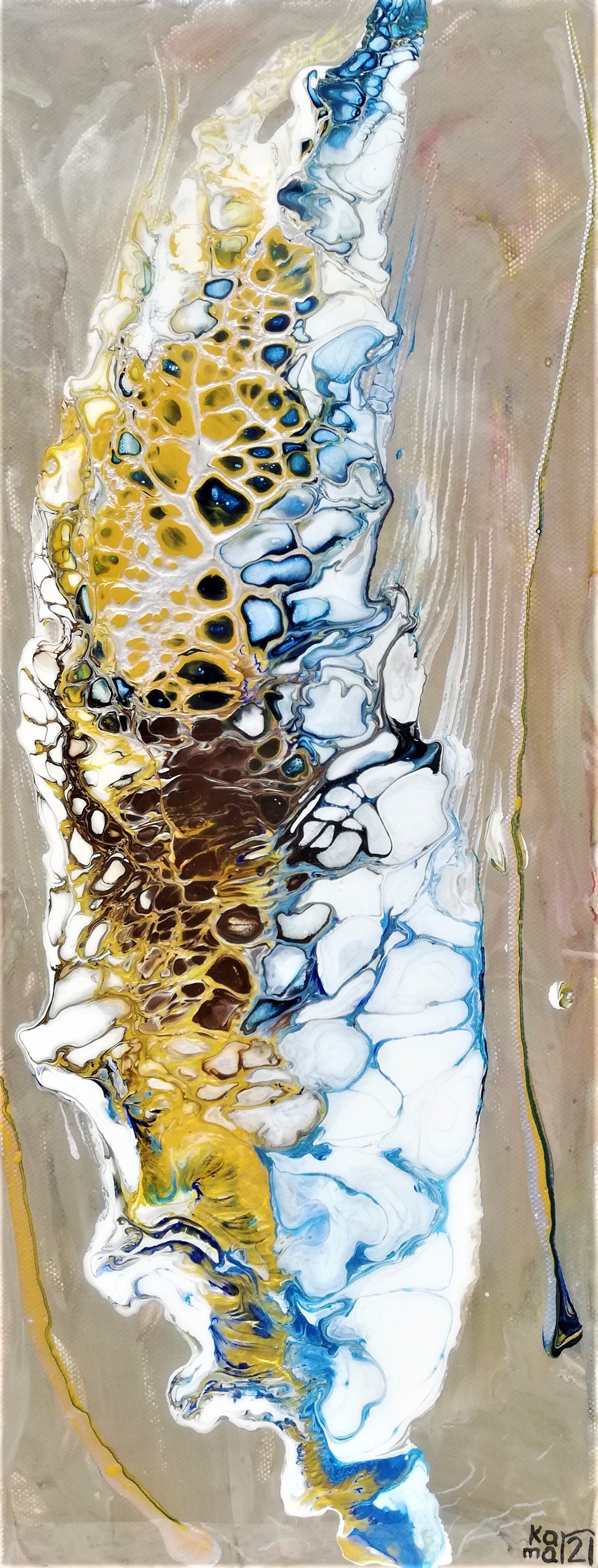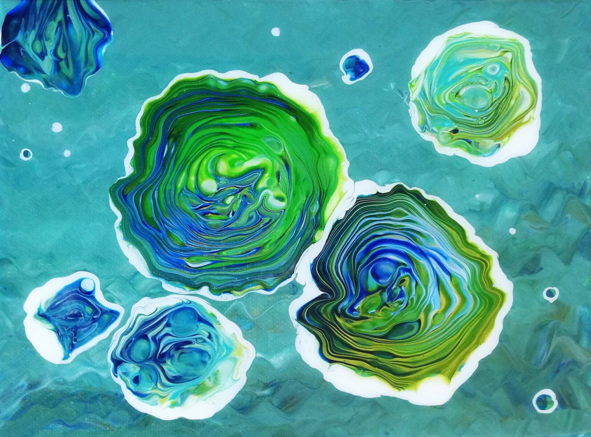Bei der pouring-Technik (deutsch: gießen) wird eine spezielle Farbmischung auf die Leinwand gegossen, durch bestimmte Zusätze entstehen mit Hilfe eines Bunsenbrenners unterschiedliche Farbzellen im Bild.